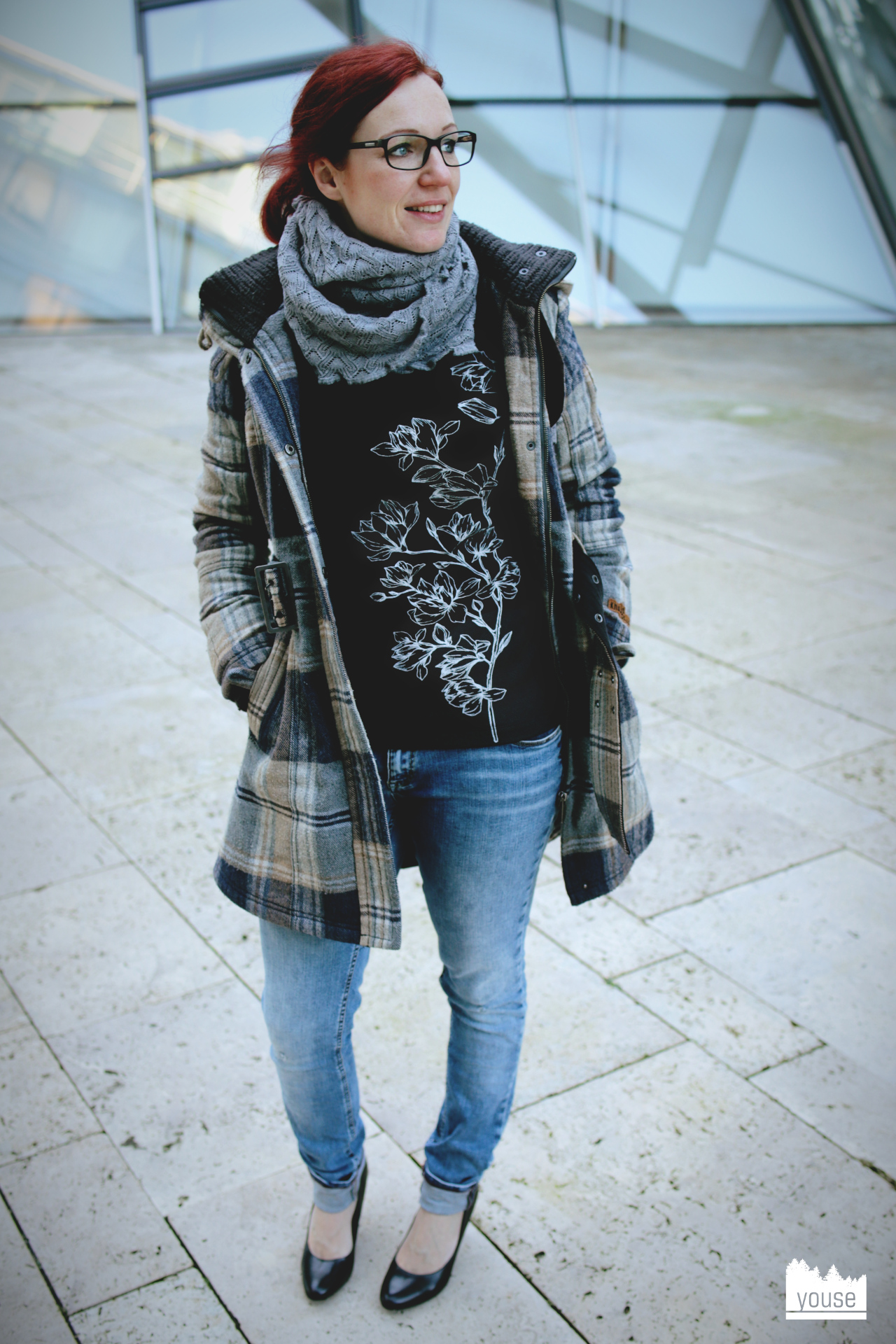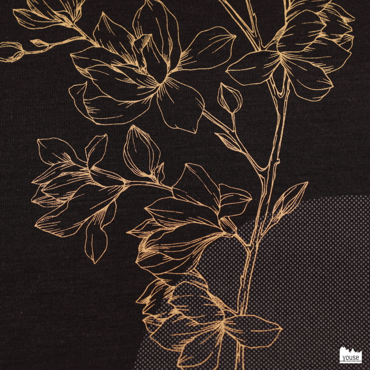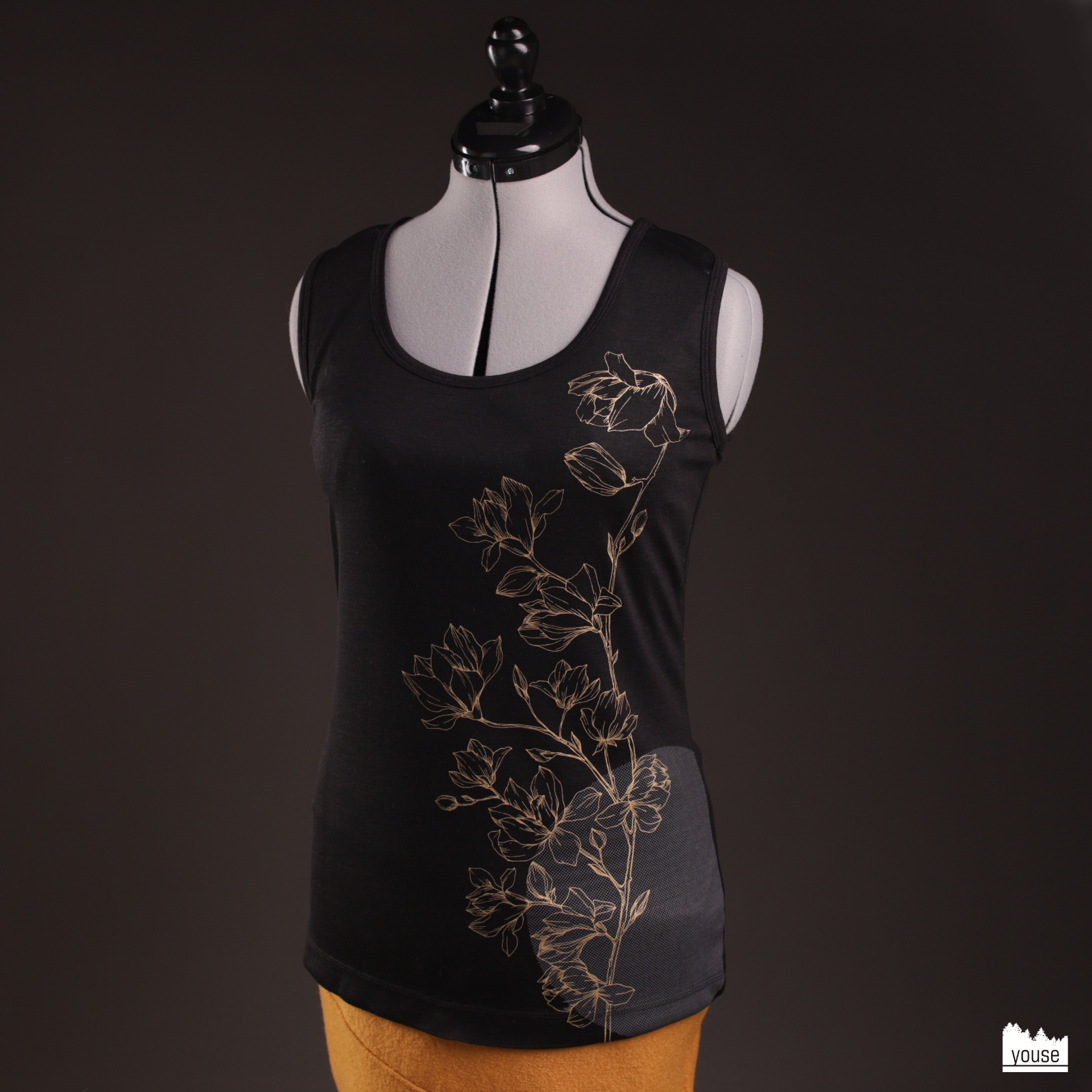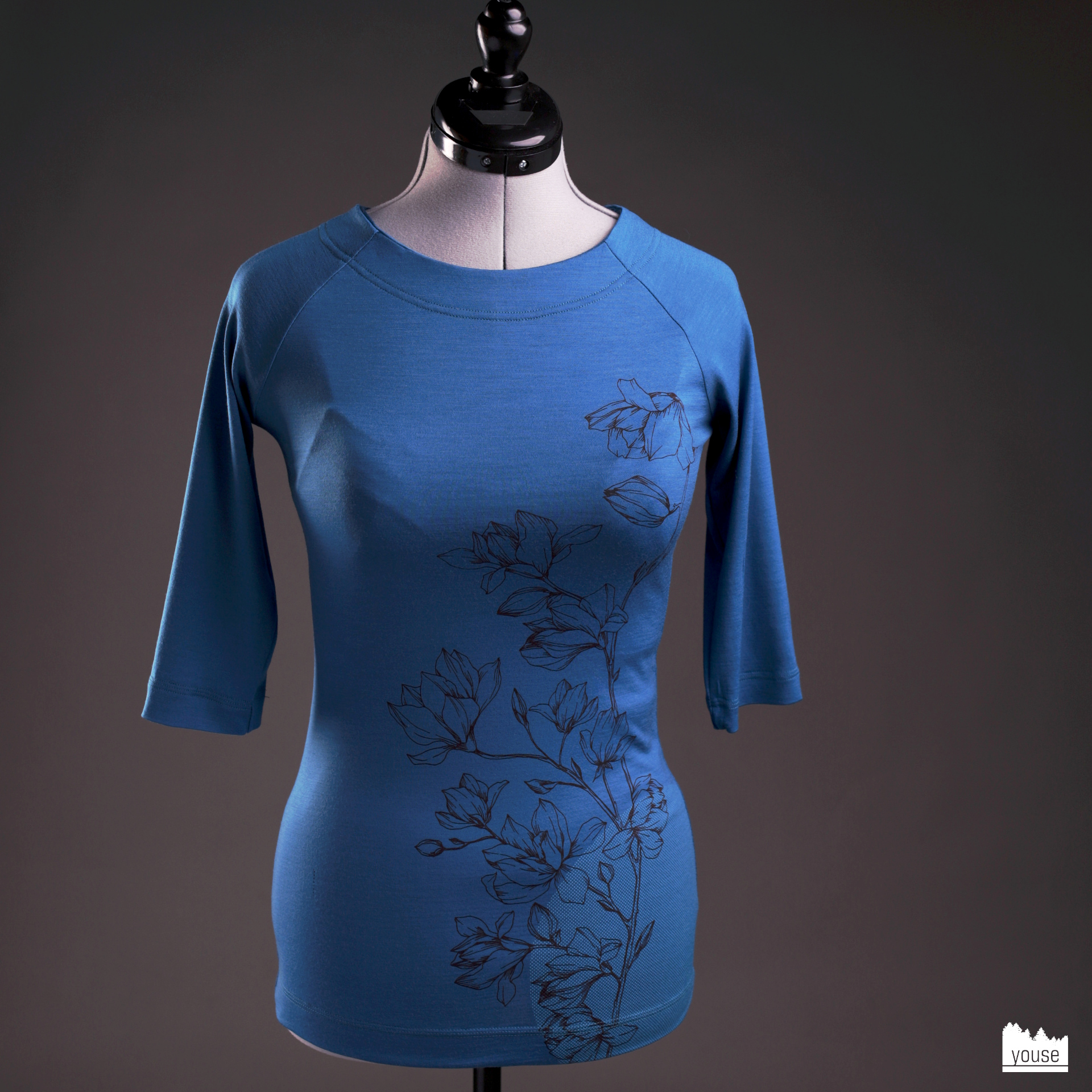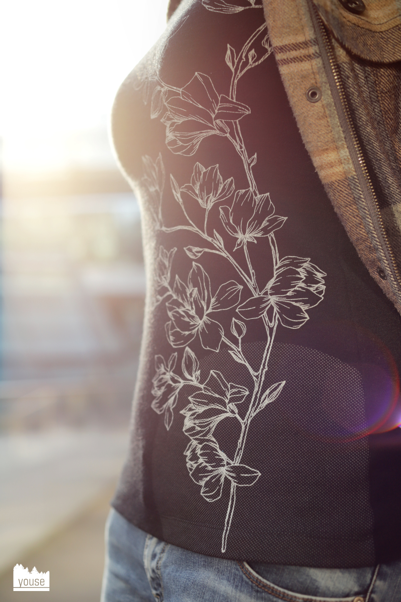 Der geschwungene Magnolienast schmiegt sich auf der linken Oberteilseite dem Körper an und wird durch den Rasterpunkt betont. Die geschwungene Form empfiehlt sich besonders für die körperbetonten youse-Oberteile.